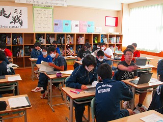 本日の5校時は、各学級とも学校祭に向けての準備として、学級劇の台本について扱う時間でした。どんな様子か見にいったところ、最初に見た1年生たちが「全員同じ姿勢で」「全員同じ視線で」「全員静かに」取り組みをしていたため、正直ちょっとおののきました。写真ではちょっと伝わりづらいかもしれませんが、素晴らしい集中力でした。その後、2・3年生の様子を見にいったところ、いつもどおり和やかに笑顔で取組をしていました。